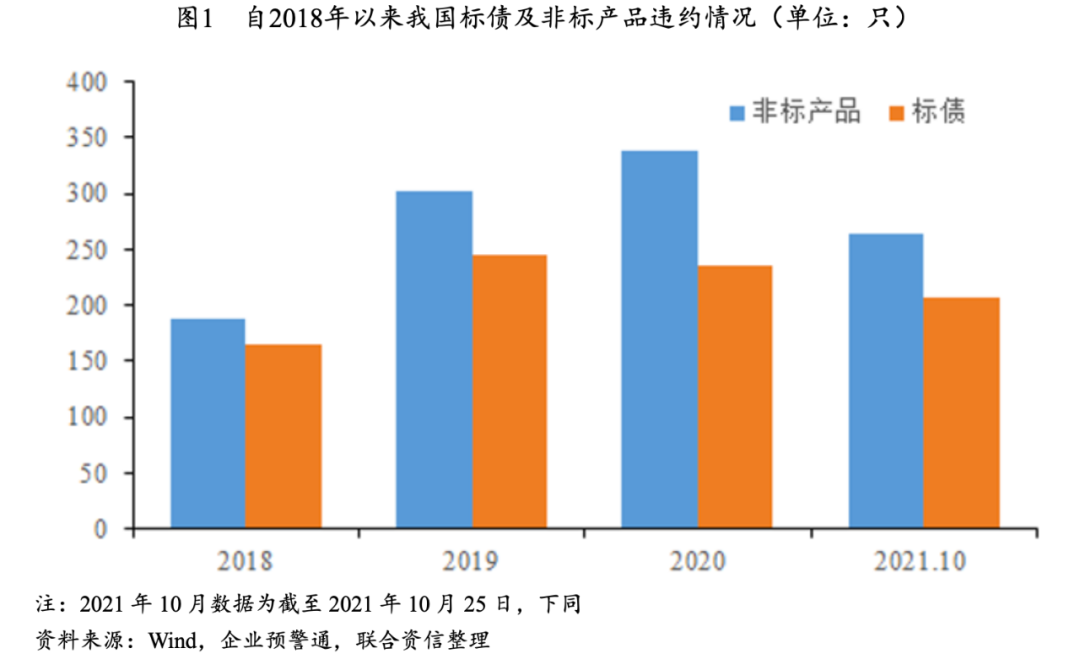 根據企業預警通、Wind查詢信息,聯合資信評估股份有限公司(以下簡稱“聯合資信”)整理統計,我國債券類融資產品違約數量自2018年以來大幅增長,其中非標產品違約數量明顯高于標債類產品(銀行間+交易所)違約數量。