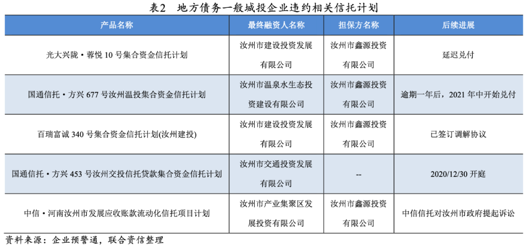 此外,尚有部分城投企業所在區域債務壓力相對一般(和西部地區區縣相比),但依舊出現違約(詳見下表的河南地區企業),此類信托計劃違約往往出乎市場意料且不可預測。我們認為,該類地區所在地政府仍有多方資源可以動用,借新還舊尚可維持,此類違約信托計劃,或與城投企業及相關政府之間的協調問題有關。如下表中違約的信托計劃,部分經過訴訟協商后,已經兌付,證明相關主體仍有償債能力,違約原因更多是因為協調方面問題。