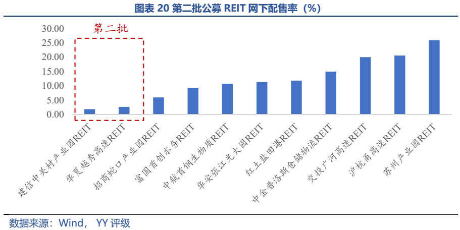 第二批公募REIT只有兩只:華夏越秀高速REIT和建信中關村REIT,整體看底層資產優秀,建信中關村REIT的現金流分派率處于園區類前列。第二批公募REITs認購“火爆”,網下和網上的配售率均不足3%;上市前幾日溢價率最高達38%、40%,之后企穩,但收益率仍高于REITs同類的其他產品。整體看,受益于底層資產的優質、現金分派率較高(建信中關村REIT)以及投資者情緒的高漲,第二批REITs表現亮眼。