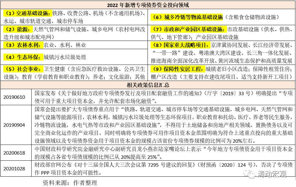 1、2021年9月30日,財(cái)政部與發(fā)改委聯(lián)合印發(fā)《關(guān)于申報(bào)2022年新增專(zhuān)項(xiàng)債券項(xiàng)目資金需求的通知》(財(cái)辦預(yù)(2021)209號(hào)),明確2022年專(zhuān)項(xiàng)債券資金繼續(xù)重點(diǎn)用于交通基礎(chǔ)設(shè)施、能源、農(nóng)林水利、生態(tài)環(huán)保、社會(huì)帶來(lái)、城鄉(xiāng)冷鏈等物流基礎(chǔ)設(shè)施(含糧食倉(cāng)儲(chǔ)物流設(shè)施)、市政和產(chǎn)業(yè)園區(qū)基礎(chǔ)設(shè)施、國(guó)家重大戰(zhàn)略項(xiàng)目、保障性安居工程等領(lǐng)域,可以看出基本和2021年一致。