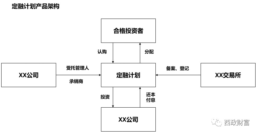 與摘掛牌收益權(quán)類產(chǎn)品相比,(1)定融類產(chǎn)品一般無明確的底層標(biāo)的;(2)發(fā)行主體資質(zhì)需比較優(yōu)質(zhì),比如主體評級AA+以上,具體根據(jù)各交易所的要求確定;(3)要求進(jìn)行場內(nèi)交易,即資金走向?yàn)橥顿Y人——交易所開設(shè)的募集專戶——被投資標(biāo)的;(4)通常可以對個人直接募集。基本架構(gòu)如下: