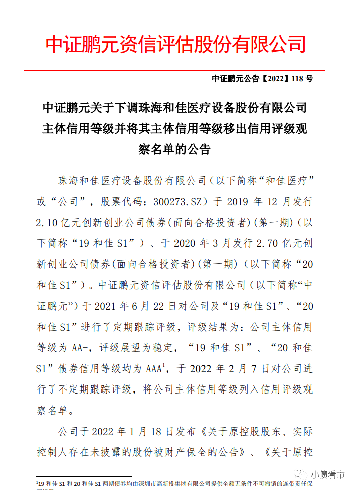 此前,2月8日中證鵬元已將和佳醫(yī)療主體信用等級(jí)列入信用評(píng)級(jí)觀察名單。
