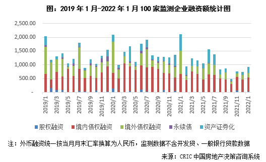 2022年1月100家典型房企的融資總量為929.46億元,環比上升26%,同比下降56%。自2019年以來,每年年初房企融資量都相對較大,均超過2000億元,而本月融資量不足千億元,一方面在當前房企危機仍未全面解除的情況下,金融機構當前白名單企業相對較少,放款較為謹慎;另一方面,部分企業為緩解年初的償債壓力已提前償還債券,同時也減少新增融資計劃,導致融資量同比下滑較大。從融資結構來看,境內債權融資499.08億元,環比上升9.8%,同比下降24.6%;境外債權融資169.66億元,環比上升10.0%,同比下降80.1%;本月資產證券化有所回升,融資223.01億元,環比上升97.9%,同比下降63.0%。