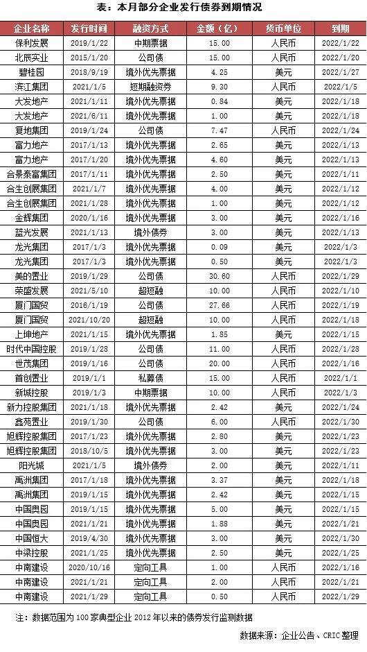 本月房企有39筆債券到期,金額共計594.22億元,環比上升77.0%,到期債券只數環比增加8只,年初企業的償債壓力較大。到期金額最高的債券為中國奧園2019年1月發行的一筆5億美元的境外優先票據,但其于1月19日公告稱將不會支付于2022年1月到期票據的余下本金及最后一期利息,債務違約。值得注意的是,本月有上坤和榮盛發展就企業存續期境外債完成了部分債券的交換要約,相當于2022年1月到期的債券到期時間已經成功延期。
