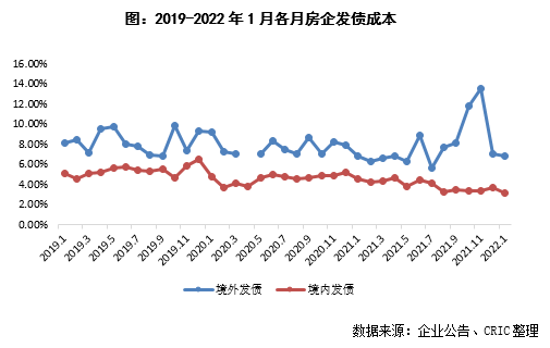 2022年1月100家典型房企新增債券類融資成本4.53%,較2021年全年下降0.76pct,其中境外債券融資成本達6.85%,下降0.19pct,境內債券融資成本3.20%,下降0.87 pct。環比2021年12月來看,總融資成本環比上升0.01pct,境外融資成本環比下降0.16pct,境內融資成本環比下降0.53pct。境內發債的企業中,可以進行發債的企業成本相對較低,融資利率在2.50%-4.00%間,白名單企業繼續發揮融資優勢,繼續發行利率較低的債券;境外發債成本方面,旭輝、遠洋等發行了綠色擔保票據,其成本不超過5%,也相對較低,還有部分企業完成了境外債的交換要約和額外發行,成本相對較高。
