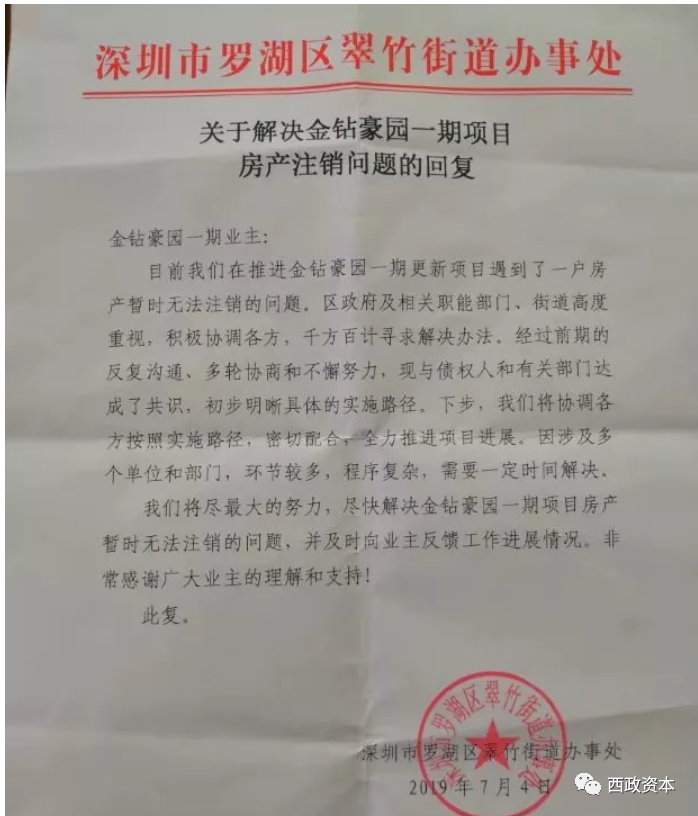 金鉆豪園項目解決方式:將項目拖延半年后,經(jīng)過羅湖區(qū)、翠竹街道辦介入?yún)f(xié)調,債權人申請解封,在項目建成后再次申請查封。