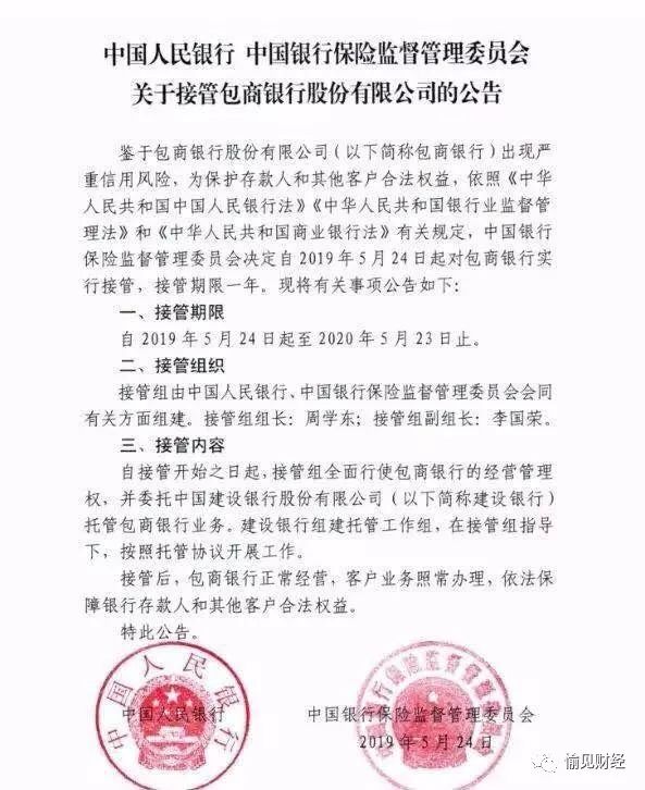 這亦與昨日央行、銀保監會的接管公告信息一致。公告稱,包商銀行“出現嚴重信用風險”,因此決定自2019年5月24日起對包商銀行實行接管,實行接管期限一年。
