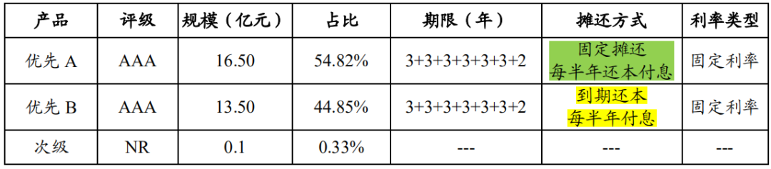 以“北京首都開發股份有限公司 2020 年度第一期資產支持票據”為例,根據募集說明書披露,優先級證券按照攤還方式不同分為優先A和優先B,優先A每半年還本付息,優先B每半年付息,到期還本。