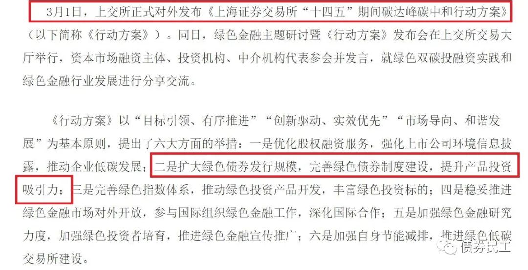 2022年3月1日,上海證券交易所發布《上海證券交易所“十四五”期間碳達峰碳中和行動方案》,明確提出要“擴大綠色債券發行規模,完善綠色債券制度建設,提升產品投資吸引力”。這對于目前快速發展的綠色債券來說,又迎來了一個利好政策。