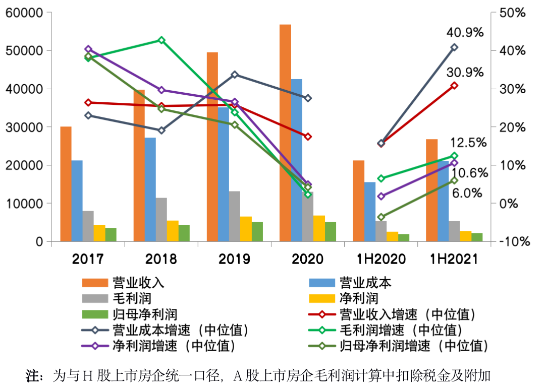 2021年上半年,CRIC監(jiān)測(cè)的80家典型上市房企整體實(shí)現(xiàn)營收收入26839億元、營業(yè)成本21039億元,營收和營業(yè)成本的增速中位值分別為30.9%和40.9%。