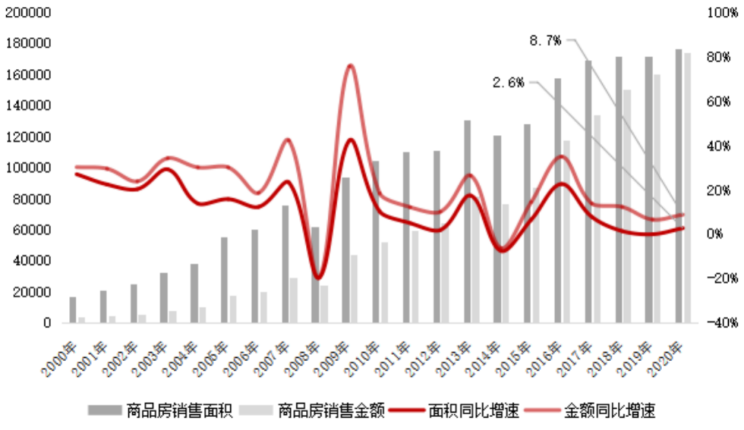 2020年全國商品房銷售面積、金額在疫后體量逐月快速回升,增速則經(jīng)歷了先升后降的總體趨勢。國家統(tǒng)計局數(shù)據(jù)顯示:全年商品房銷售面積、金額達176086萬平方米和173613億元,累計同比上漲2.6%和8.7%。