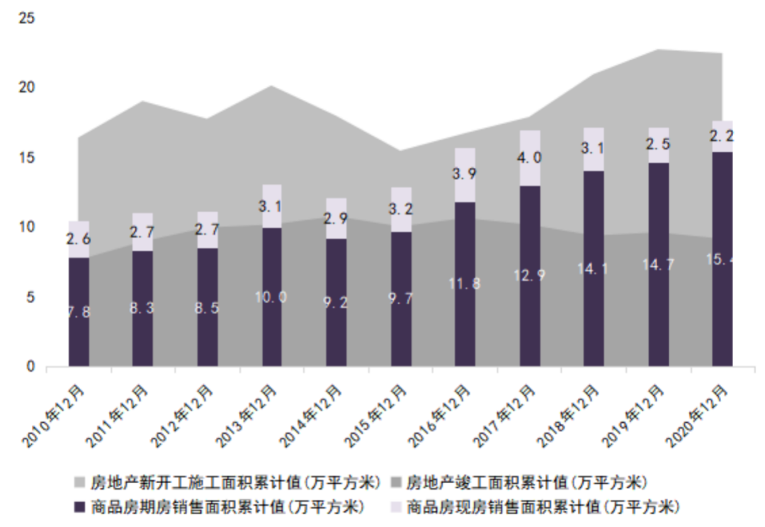2020年房屋施工面積累計達926759萬平方米,已超過2018年與2019年年底規(guī)模,同比增長3.7%。由于竣工節(jié)點的即將到來,2020年房屋施工面積維持在歷史高點。