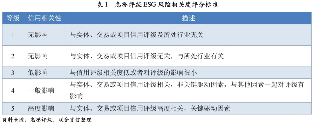 2019年1月,惠譽評級首先推出了ESG相關(guān)性模型(ESG Relevance Scores)。ESG相關(guān)性模型通過分辨不同ESG因素與信用評級的相關(guān)性來確定哪些ESG因素可以影響企業(yè)的信用水平,并最終根據(jù)信用相關(guān)性評定不同等級。惠譽評級根據(jù)市場中在環(huán)境、社會和治理方面普遍存在影響信用水平的因素歸納整理了14個相關(guān)問題,并根據(jù)不同行業(yè)調(diào)整特定的ESG風險。該ESG風險相關(guān)度評分主要分為5個等級,其中3至5等級屬于和企業(yè)信用評級相關(guān),評分越高相關(guān)性越大,最終可能影響企業(yè)的信用評級變化。