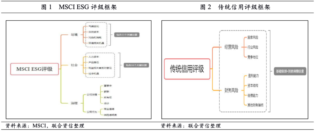 ESG是環(huán)境(Environmental)、社會(Social)和治理(Governance)的英文簡稱,而ESG評級即是針對企業(yè)在環(huán)境、社會和公司治理三個方面進行評分考核,從長遠角度判斷企業(yè)是否具備可持續(xù)發(fā)展的價值。ESG評級主要由市場中專注于提供ESG評級的第三方企業(yè)披露,比如MSCI等機構(gòu)。企業(yè)信用評級簡單來說就是對企業(yè)信用風險的評估,考察發(fā)債企業(yè)的償債能力和償債意愿,主要由傳統(tǒng)信用評級機構(gòu)披露。從概念上來看,ESG評級和信用評級評估的側(cè)重方向不同。我們選取了MSCI公開披露的ESG評級方法和傳統(tǒng)信用評級方法作為對比,以觀察兩種評級體系在評級方法、技術(shù)模型和指標選取等方面存在的本質(zhì)上的區(qū)別。