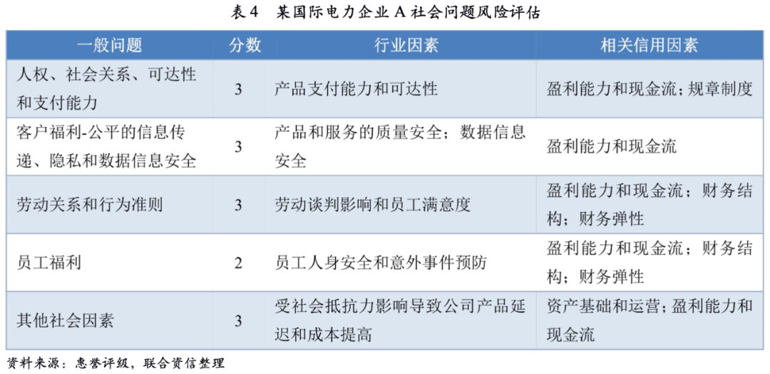惠譽評級結(jié)合環(huán)境、社會和公司治理三大方面對某國際電力企業(yè)A進行風險評估,綜合匯總了ESG對企業(yè)A信用評級驅(qū)動因素并通過各個驅(qū)動因素數(shù)量得出ESG信用綜合評分。該ESG信用綜合評分表明ESG風險對企業(yè)A信用水平有很大影響,其中公司治理問題和信用評級關(guān)聯(lián)度最大,未來需重點關(guān)注。