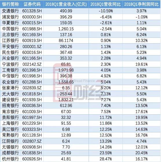先看在A股上市的26家銀行2018年一季度的營收變動情況:
