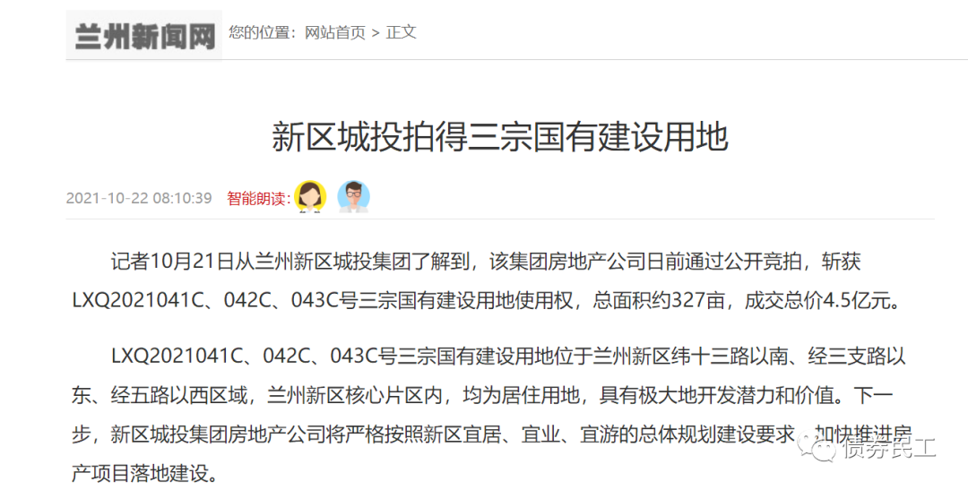 2021年10月22日,蘭州新區(qū)城市發(fā)展投資集團有限公司的下屬子公司蘭州新區(qū)房地產(chǎn)開發(fā)有限公司以4.5億元的價格摘得蘭州新區(qū)總出讓面積為327畝的土地,土地性質(zhì)為住宅用地。