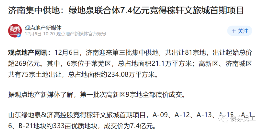 2021年12月6日,濟南市投資控股集團有限公司聯(lián)合山東綠地泉以7.4億元的價格摘得稼軒文旅城首期項目總出讓面積為333畝的土地。