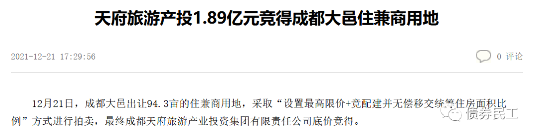 2021年12月21日,成都文化旅游發(fā)展集團有限責任公司的子公司成都天府旅游產(chǎn)業(yè)投資集團有限責任公司以1.89億元的價格摘得成都大邑縣總出讓面積為94.3畝的土地,土地性質(zhì)為住兼商用地。