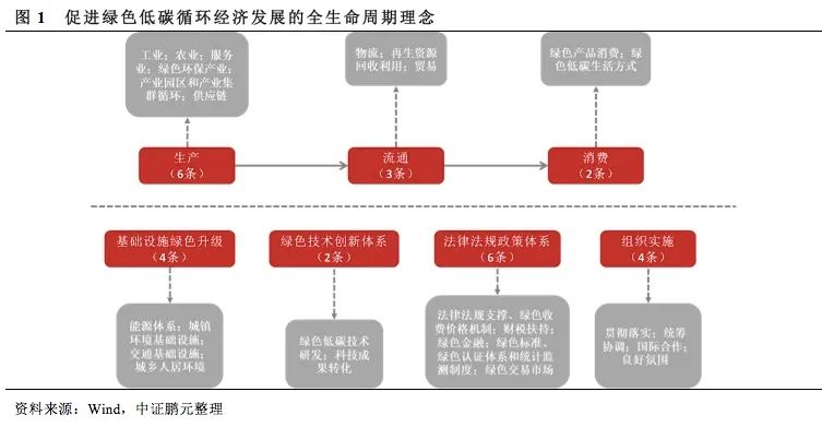 《指導(dǎo)意見(jiàn)》共30條,用全生命周期理念理清了綠色低碳循環(huán)發(fā)展經(jīng)濟(jì)體系建設(shè)過(guò)程。前3條為指導(dǎo)思想、工作原則和主要目標(biāo),其余27條涉及生產(chǎn)到流通再到消費(fèi)環(huán)節(jié),還涉及基礎(chǔ)設(shè)施綠色升級(jí)、綠色技術(shù)創(chuàng)新、法律法規(guī)政策、組織實(shí)施等各個(gè)支持環(huán)節(jié)。