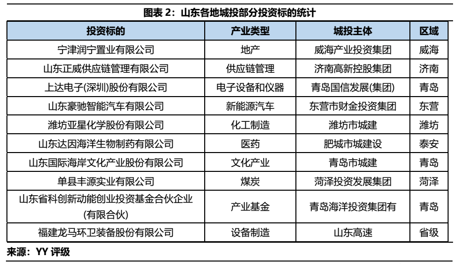 產(chǎn)業(yè)投資于城投而言在一定程度上體現(xiàn)了風(fēng)險(xiǎn)加成,就山東而言,資源稟賦的不同也代表著產(chǎn)業(yè)化的方式以及投資標(biāo)的的差異。資本較為充足的地區(qū)例如青島、濟(jì)南等地可通過(guò)收并購(gòu)方式引入外省企業(yè),下沉地區(qū)聚焦省內(nèi),助力地方龍頭企業(yè)的運(yùn)營(yíng),但最終城投能否降低債務(wù)壓力、實(shí)現(xiàn)穩(wěn)定盈利仍需要時(shí)間的檢驗(yàn)。