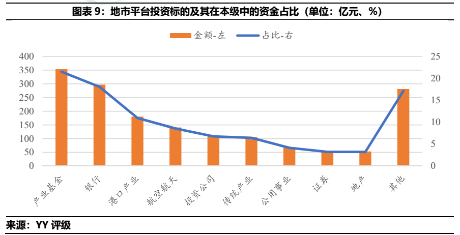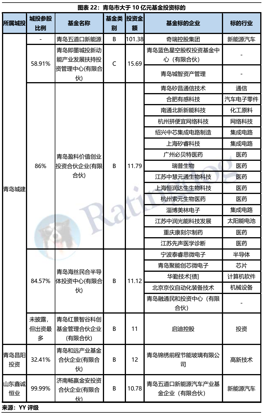 總體來(lái)看,山東城投偏好于產(chǎn)業(yè)基金、銀行、投資類公司的投資,上述標(biāo)的投資分別占去城投類投資總額的25.52%、13.29%和9.33%。分行政區(qū)域劃分來(lái)看,僅有國(guó)家級(jí)開發(fā)區(qū)投資最多為地產(chǎn)行業(yè),其余皆為產(chǎn)業(yè)基金。分地市級(jí)來(lái)看,產(chǎn)業(yè)基金投資占比第一的區(qū)域分別為青島、省級(jí)平臺(tái)、濰坊、泰安和德州。銀行投資在投資金額中占比最高的區(qū)域則是濟(jì)南、煙臺(tái)、濟(jì)寧、淄博和東營(yíng)。