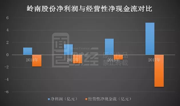 公開數(shù)據(jù)顯示:2014-2017年,嶺南股份凈利潤合計(jì)約10.65億元,經(jīng)營性現(xiàn)金凈流出約9.25億。2017年,公司經(jīng)營性凈現(xiàn)金流與凈利潤的背離程度明顯擴(kuò)大,凈利潤約5.18億元,經(jīng)營性現(xiàn)金凈流出約5.21億元,兩者相差數(shù)額超過10億。