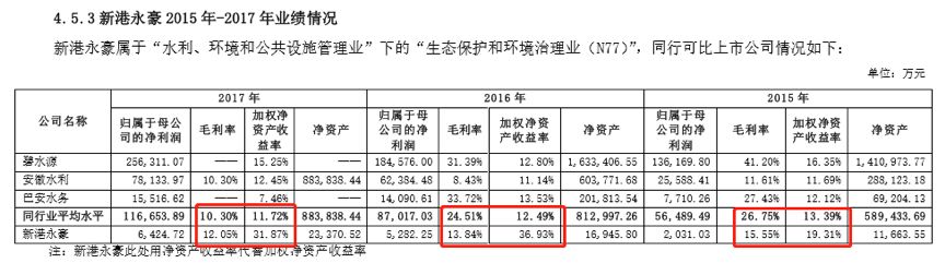 再看看這家公司與同行業(yè)相同財(cái)務(wù)指標(biāo)的對(duì)比情況:2015-2017年,新港永豪ROE分別為19.31%、36.93%及31.87%,同行業(yè)平均ROE分別為13.39%、12.49%及11.72%。以下為公開信息中披露的行業(yè)對(duì)比情況: