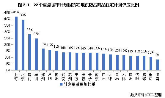 通過對22個重點城市2021年供地計劃中商品住宅及租賃住宅用地的規(guī)模進行梳理和測算,結果發(fā)現:除濟南外,其余21個城市租賃房供地計劃占比均高于10%,尤其是北京和上海兩個一線城市,租賃宅地占商品住宅用地的比重均在四成左右;其次是廈門、深圳、合肥、杭州等城市,比重均超15%;余下的重點城市中,除濟南相對較低之外,其余城市租賃宅地計劃供應量均按照中央10%的“紅線”設置,約在10%左右。