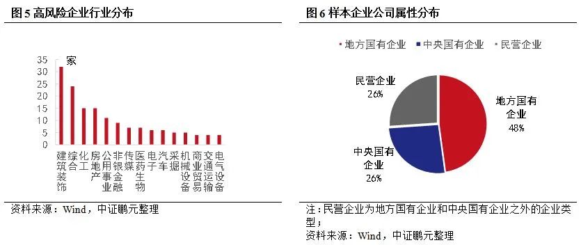 從行業分布看,高風險企業主要分布在建筑裝飾和綜合行業,其次是化工和房地產行業。從公司屬性看,高風險企業以地方國有企業為主,占比48%。
