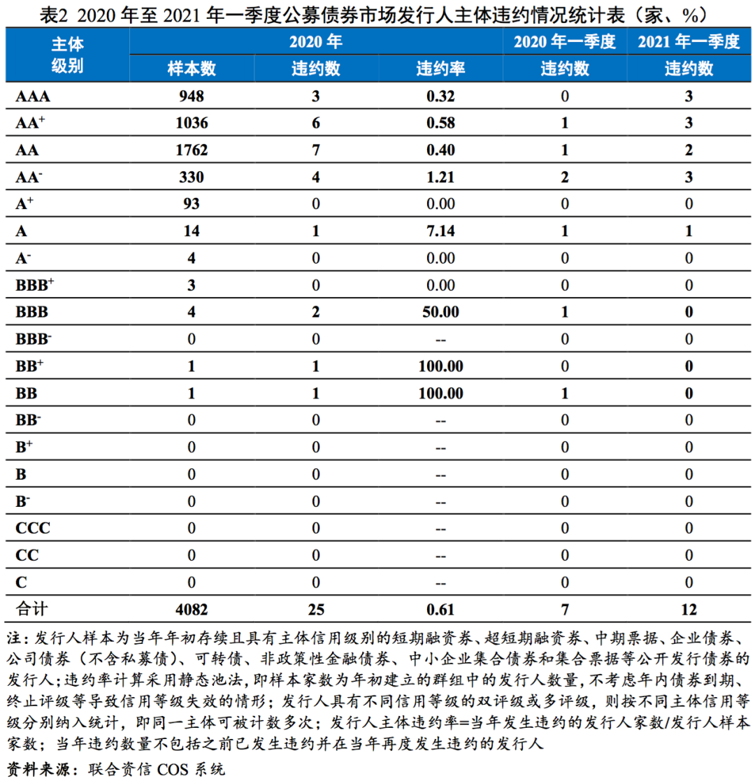 本文從違約情況、等級調整與等級遷移、利差表現三方面分析我國債券市場評級表現并對評級質量進行檢驗。2021年一季度,海航系企業破產重整、弱資質主體違約風險持續出清,債券市場平穩運行、信用風險整體可控。
