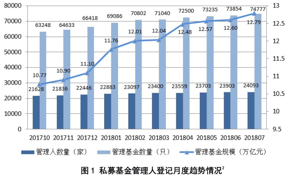 根據(jù)中基協(xié)的私募基金月報(bào),截至2018年7月底,私募基金總規(guī)模為12.79萬億元。