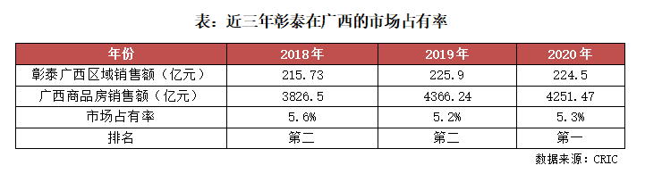 彰泰作為廣西規(guī)模最大的本土房企,2018-2020年連續(xù)三年銷售額均超過(guò)200億元,其中2020年在廣西區(qū)域的全口徑銷售額達(dá)到224.5億元、權(quán)益銷售金額達(dá)到161.4億元,均位列第一。根據(jù)廣西2020年商品房銷售額4251.5億元計(jì)算,市場(chǎng)占有率約為5%,超過(guò)碧桂園位居首位。今年一季度,彰泰繼續(xù)以47.44億元領(lǐng)跑,增長(zhǎng)預(yù)期向好。