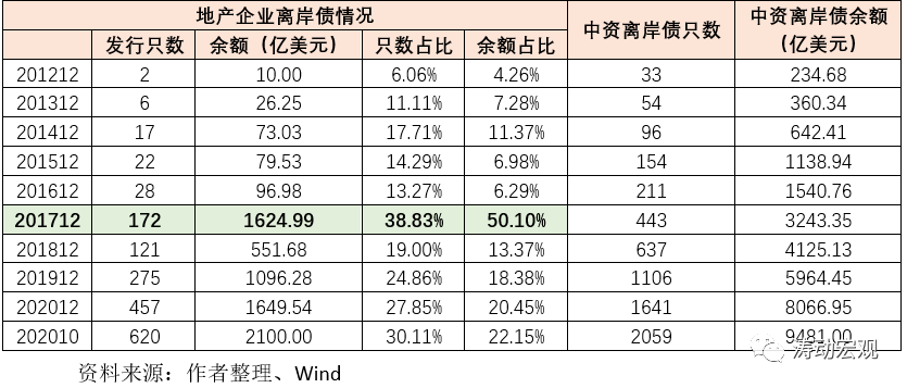 2、自2012年11月15日國資背景的中國海外發(fā)展在香港發(fā)行第一只離岸地產(chǎn)債以來,不到十年的時間里,中資離岸地產(chǎn)債數(shù)量已驟升至目前的620只,規(guī)模亦達到2100億美元(約合人民幣1.40萬億元),占全部中資離岸債規(guī)模的22%以上,成為僅次于金融債的第二大中資離岸債品種。