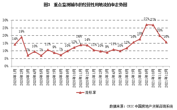 2021年12月,在17城三輪集中土拍收官及三四線城市土地成交放量的拉動下,年末土地成交翹尾現(xiàn)象如期而至,當月成交規(guī)模突破4億平方米,同比也僅下降了3%。與此同時,信貸環(huán)境邊際改善下,土地流拍現(xiàn)象也有所好轉,集中土拍的重點城市中僅個別城市流拍率較上一輪大增。