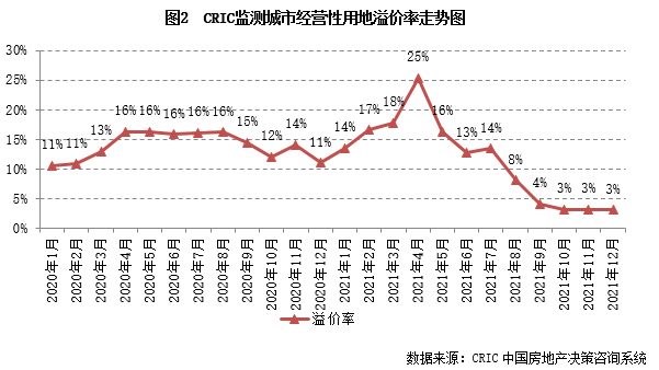 市場熱度方面。盡管多個重點城市三批次集中土拍規(guī)則略有松綁,但受多數(shù)房企資金壓力仍舊較大影響,多數(shù)城市的土拍熱度并未較二輪明顯提升,而成交主力中小城市土地市場亦維持在低熱狀態(tài)。因此,土地成交溢價率仍延續(xù)低位運行,12月平均溢價率為3.2%,與上月持平,與去年同期相比,溢價率下降了近8個百分點。