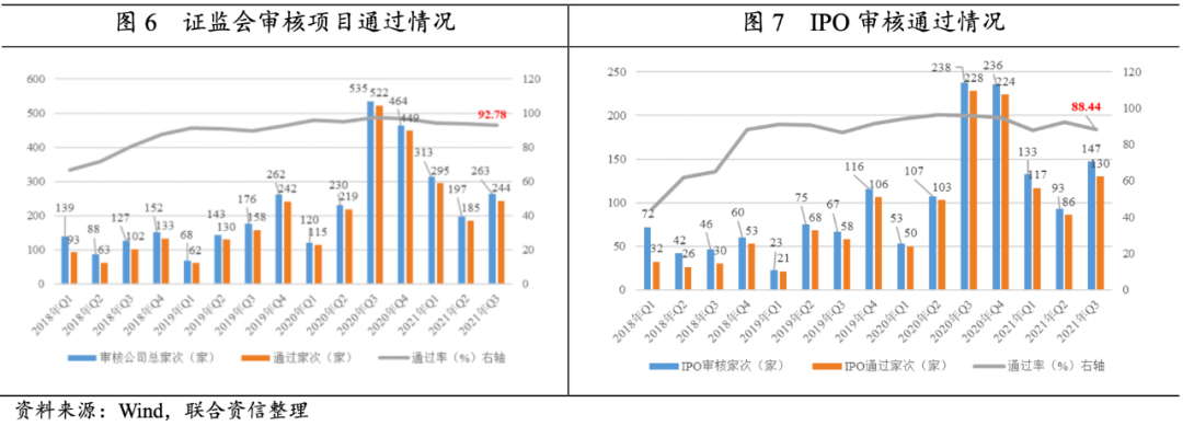 2021年三季度,發(fā)審委/上市委/并購重組委員會審核項目總家次及通過家次分別為263家和244家,分別為二季度的1.34倍和1.32倍;其中IPO審核家次及過會家次分別為147家和130家,通過率為88.44%,環(huán)比下降4.03個百分點。隨著注冊制的落地,發(fā)審委/上市委/并購重組委員會審核項目數(shù)量在2020年下半年達到峰值,雖然2021年三季度的審核及通過項目數(shù)量較二季度大幅增加,但較上年同期仍有所減少。
