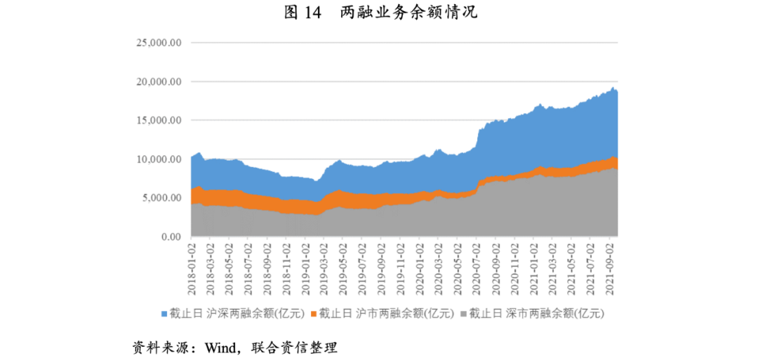 2021年三季度,滬深兩融余額隨市場活躍度攀升不斷創(chuàng)出新高。2020年至今,證券市場持續(xù)回暖,滬深兩市兩融余額呈增長態(tài)勢。2021年一季度,滬深指數(shù)有所調(diào)整,兩融余額在1月達到階段性高點17156.53億元后有所回落;2021年二、三季度,隨著市場活躍度的攀升,兩融余額不斷創(chuàng)出新高。截至2021年9月末,滬深兩市兩融余額18415.25億元,較上季度末增長3.21%。