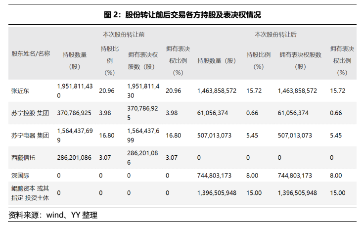 本次交易完成后,上市公司原控股股東、實(shí)控人張近東及其一致行動(dòng)人蘇寧控股集團(tuán)持股比例將降至16.38%,蘇寧電器集團(tuán)持股比例降至5.45%,鯤鵬資本持股比例為15%,深國際持股比例為8%,張近東仍為蘇寧易購的第一大表決權(quán)股東。