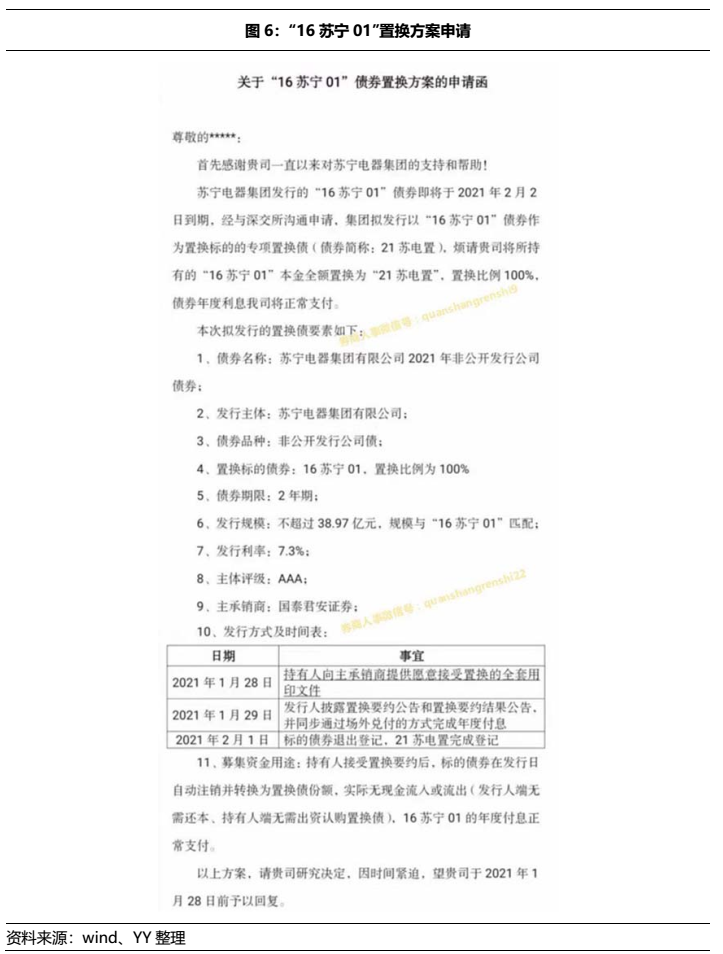 1月26日,電器集團(tuán)召開千萬以上持有人會議,擬發(fā)行以“16蘇寧01"債券作為置換標(biāo)的的專項(xiàng)置換債“21蘇電置”,置換比例為100%,發(fā)行規(guī)模與16蘇寧01匹配,不超過38.97億元,發(fā)行利率為7.3%,持有人接受置換要約后,標(biāo)的債券在發(fā)行日自動(dòng)注銷并轉(zhuǎn)換為置換債份額,實(shí)際無現(xiàn)金流入或流出,16 蘇寧01的年度付息正常支付。此番操作,無疑是再融資受阻下的決定,最終置換債“21蘇電01”發(fā)行28.54億元。