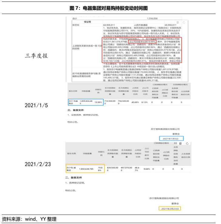 從時(shí)間線及主體來看,2021年以來電器集團(tuán)共質(zhì)押了近5.63億股,張近東共質(zhì)押了1.12億股,主要用于補(bǔ)充質(zhì)押和融資相關(guān)。截至2021年2月23日,蘇寧電器集團(tuán)持有公司19.88%的股份,共計(jì)質(zhì)押8.97億股,占所持股份的48.47%;截至2021年2月3日,張近東及一致行動(dòng)人蘇寧控股集團(tuán)有限公司合計(jì)持有公司24.94%股份,共計(jì)質(zhì)押4.11億股,占所持股份的17.72%。