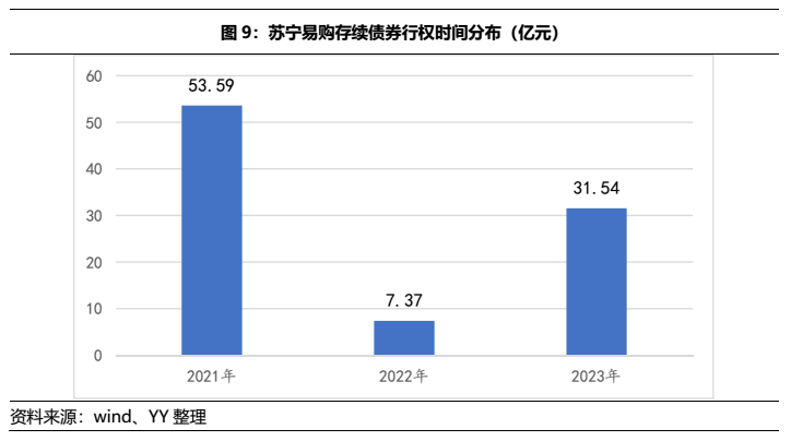 截至2021年3月1日,蘇寧易購存續(xù)債券12只共計(jì)92.13億元,其中包含4只ABS共計(jì)33.54億元。按行權(quán)時(shí)間統(tǒng)計(jì),最近一只是即將在4月19日到期的 “18蘇寧01”,余額13.32億元。從時(shí)間段來看,2021年需行權(quán)53.59億元,2022年面臨7億元的行權(quán)壓力(為19云智優(yōu)),2023年需行權(quán)31.54億元(包括15.924億元的20云享A、6.635億元的20云享B、3.981億元的20云享C)。