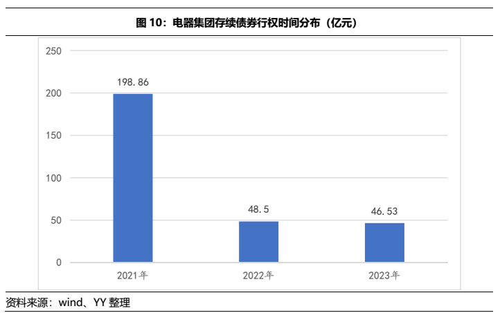 截至2021年3月1日,電器集團(tuán)存續(xù)債共20只,其中私募債12只,另有6只ABS和2只ABN,合計(jì)293.89億元。按行權(quán)時(shí)間統(tǒng)計(jì),最近一只是3月22日面臨行權(quán)的合計(jì)16.4億元“17蘇寧01”。債券行權(quán)分布來看,2021年是集團(tuán)壓力最重的一年,面臨198.86億元的兌付(包含83.35億元的ABS和10.63億元的ABN);2022面臨48.5億元的行權(quán)(包含28億元的20蘇寧A1、4億元的20蘇寧A2);2023年有46.53億元的行權(quán)。