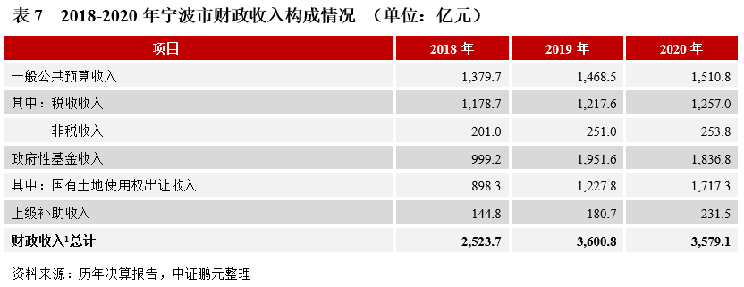 (3)財(cái)政實(shí)力:近年來(lái),寧波市財(cái)政收入穩(wěn)健增長(zhǎng),綜合財(cái)政實(shí)力在省內(nèi)僅次于杭州市。2020年,寧波出臺(tái)一系列助力復(fù)工復(fù)產(chǎn)政策以對(duì)沖疫情影響,其民營(yíng)外向型經(jīng)濟(jì)實(shí)現(xiàn)較快復(fù)蘇,帶動(dòng)稅收收入取得同比正增長(zhǎng),且稅收收入占比保持較高水平;2020年寧波樓市調(diào)控先揚(yáng)后抑,但同時(shí)繼續(xù)放寬落戶條件,居民購(gòu)房熱情高漲,全年商品房住宅量?jī)r(jià)齊升,土地出讓金同比大幅增長(zhǎng),較好緩解了疫情對(duì)政府性基金收入的拖累。