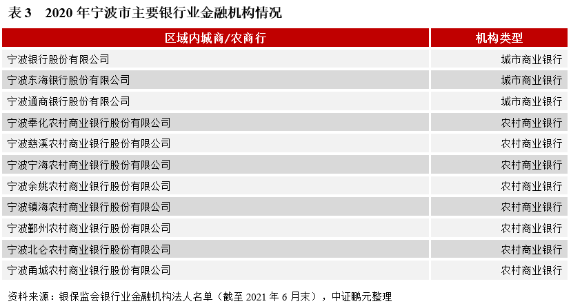 (5)金融發(fā)展:活躍發(fā)達(dá)的民營(yíng)經(jīng)濟(jì)利好寧波的金融發(fā)展, 2020年末寧波金融機(jī)構(gòu)人民幣各項(xiàng)存款余額23,166.7億元,同比增長(zhǎng)14.2%;人民幣各項(xiàng)貸款余額25,052.0億元,同比增長(zhǎng)15.1%。截至2021年6月末,寧波市共有城商行3家、農(nóng)商行8家(見表3),同時(shí)還有1家農(nóng)村信用社(象山縣農(nóng)村信用合作聯(lián)社)、12家村鎮(zhèn)銀行(余姚通濟(jì)村鎮(zhèn)銀行股份有限公司、寧波市海曙國(guó)民村鎮(zhèn)銀行有限責(zé)任公司、寧波慈溪中銀富登村鎮(zhèn)銀行有限責(zé)任公司等),為當(dāng)?shù)仄髽I(yè)、居民提供了有效的融資渠道和便捷的金融服務(wù),其中部分銀行已在政策扶持之下逐漸將業(yè)務(wù)拓展至全國(guó)范圍。