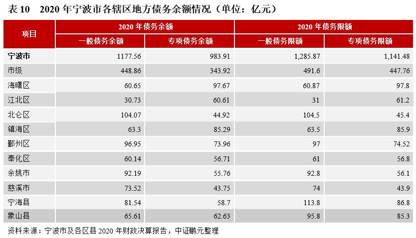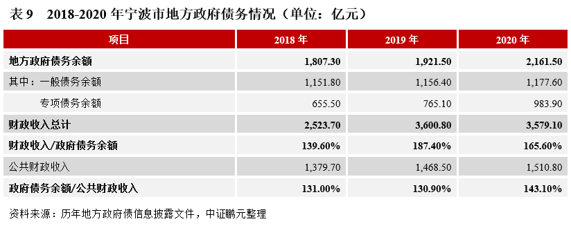(4)政府債務(wù):截至2020年末,寧波市地方政府債務(wù)余額2,161.50億元。從償債能力和債務(wù)壓力來(lái)看,寧波市財(cái)政收入對(duì)地方政府債務(wù)余額的覆蓋程度較好,近三年的覆蓋比率均超過130%;地方政府債務(wù)余額/公共財(cái)政收入的比率處于適當(dāng)水平,近三年的平均比率為134.94%,債務(wù)壓力一般。從融資空間來(lái)看,除寧波市級(jí)、寧海縣、象山縣外,市六區(qū)和兩個(gè)縣級(jí)市的政府債務(wù)余額均已逼近限額,高度依賴新增債務(wù)額度。