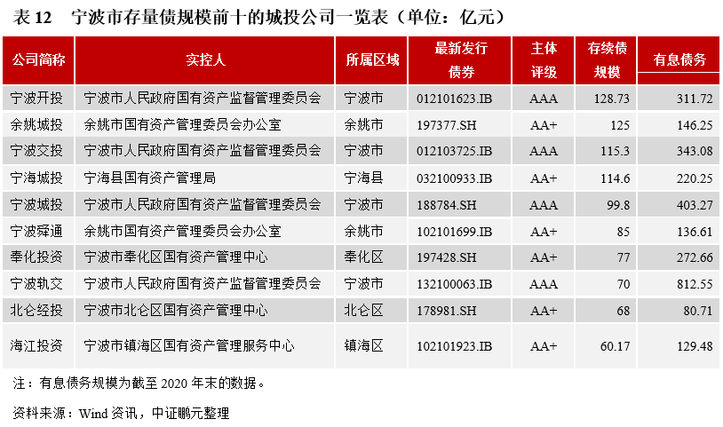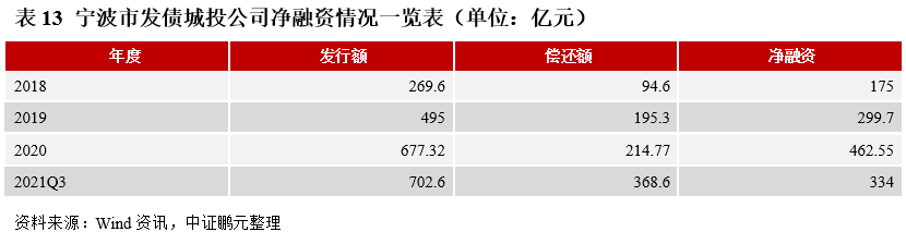 (5)城投公司:截至2021年10月末,寧波共有62家發(fā)債城投公司。AAA級(jí)主體共4家,AA+級(jí)共24家,AA級(jí)共32家;發(fā)債總體上較為活躍,目前存量債規(guī)模在50億元以上的有15家,存量債規(guī)模在10億元及以上的有37家;近幾年寧波市城投公司的新發(fā)債券規(guī)模均高于到期償債規(guī)模,凈融資呈擴(kuò)大態(tài)勢(shì)。下一階段,寧波的區(qū)域經(jīng)濟(jì)財(cái)政實(shí)力有望進(jìn)一步提升,其在債券市場(chǎng)上的活躍度還會(huì)繼續(xù)提升。