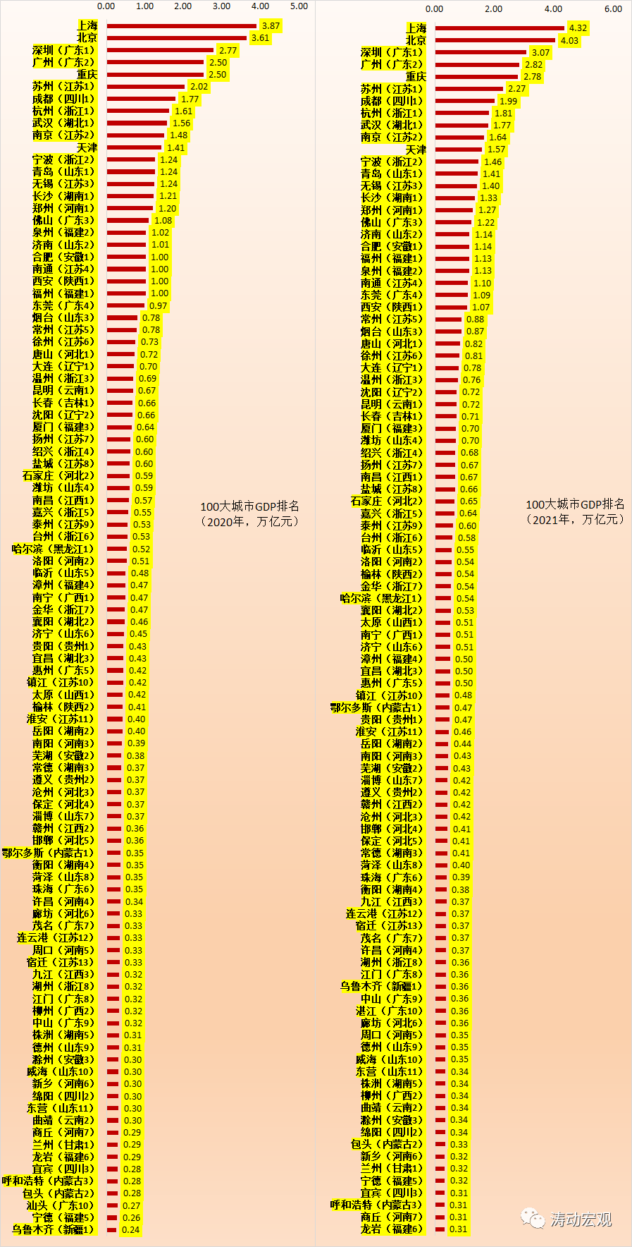(2)2021年,前100大城市的經(jīng)濟(jì)總量平均為0.81萬(wàn)億,但實(shí)際上只有28個(gè)城市的經(jīng)濟(jì)總量超過(guò)這一平均水平(占比僅有28%),意味著100大城市中有72個(gè)城市的經(jīng)濟(jì)總量低于平均水平。要知道,2020年100大城市的經(jīng)濟(jì)總量平均值為0.66萬(wàn)億,但有33個(gè)城市的經(jīng)濟(jì)總量超過(guò)平均水平(占比達(dá)到33%)。