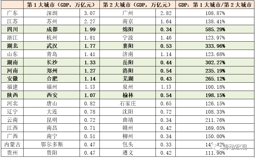 具體看,成都的經(jīng)濟(jì)總量達(dá)到1.99萬(wàn)億,是四川第2大城市綿陽(yáng)的5.85倍;武漢的經(jīng)濟(jì)總量達(dá)到1.77萬(wàn)億,是湖北第2大城市襄陽(yáng)的3.34倍;長(zhǎng)沙的經(jīng)濟(jì)總量達(dá)到1.33萬(wàn)億,是湖南第2大城市岳陽(yáng)的3.02倍;合肥的經(jīng)濟(jì)總量達(dá)到1.14萬(wàn)億,是安徽第2大城市蕪湖的2.65倍;鄭州的經(jīng)濟(jì)總量達(dá)到1.27萬(wàn)億,是河南第2大城市洛陽(yáng)的2.35倍;西安的經(jīng)濟(jì)總量達(dá)到1.07萬(wàn)億,是陜西第2大城市榆林的1.98倍等等。