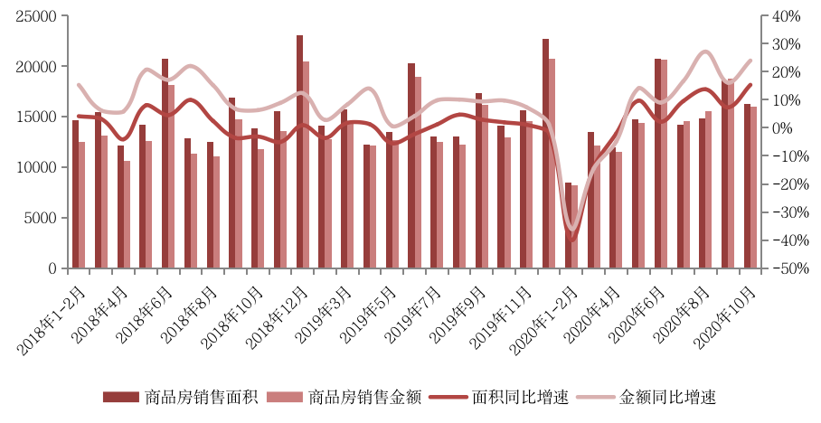國家統(tǒng)計局數(shù)據(jù)顯示:2020年10月全國商品房銷售面積16221萬平方米,環(huán)比下降13%,銷售金額16018億元,環(huán)比下降14%。同比來看,2020年10月銷售面積與金額分別比2019年10月增加15%和24%,今年的“銀十”發(fā)力明顯。